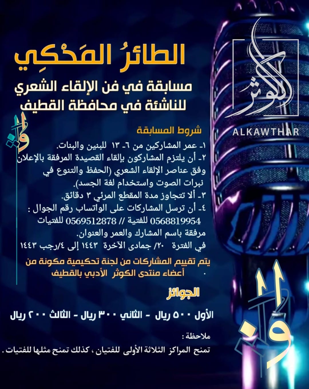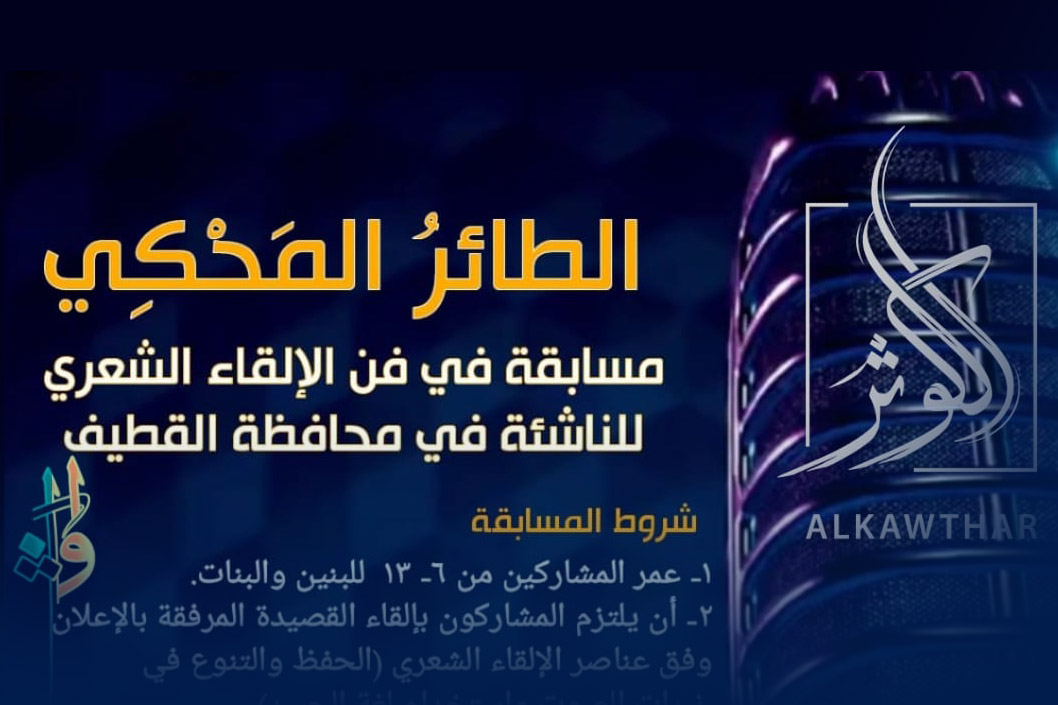 ينظم منتدى الكوثر الأدبي مسابقة ”الطائر المحكي“ في فن الإلقاء الشعري للناشئة في محافظة القطيف.
