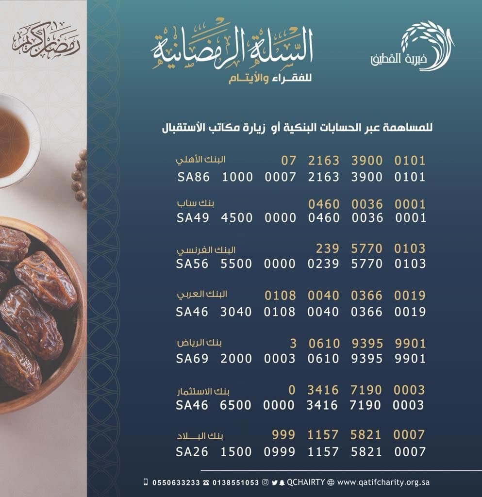 يمكن دعم السلة الرمضانية من خلال مكاتب الجمعية أو الإيداع البنكي في الحسابات الموضحة.