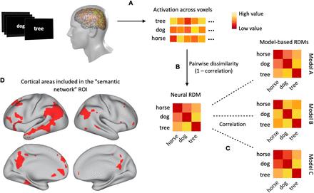 استُخدمت النمذجة الحاسوبية للتنبؤ بدرجة التشابه بين معاني الكلمات وفقًا لكل نوع من المعلومات، وقورنت هذه التنبؤات بأوجه التشابه بين أنماط التنشيط العصبي المقابل لكل معنى كلمة.