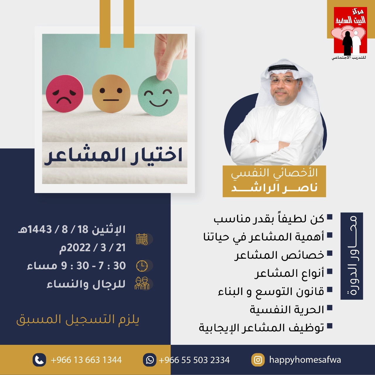 ينظم مركز البيت السعيد بصفوى دورة بعنوان «اختيار المشاعر» يقدمها الأخصائي النفسي ناصر الراشد، وذلك مساء يوم الاثنين بمقر المركز.