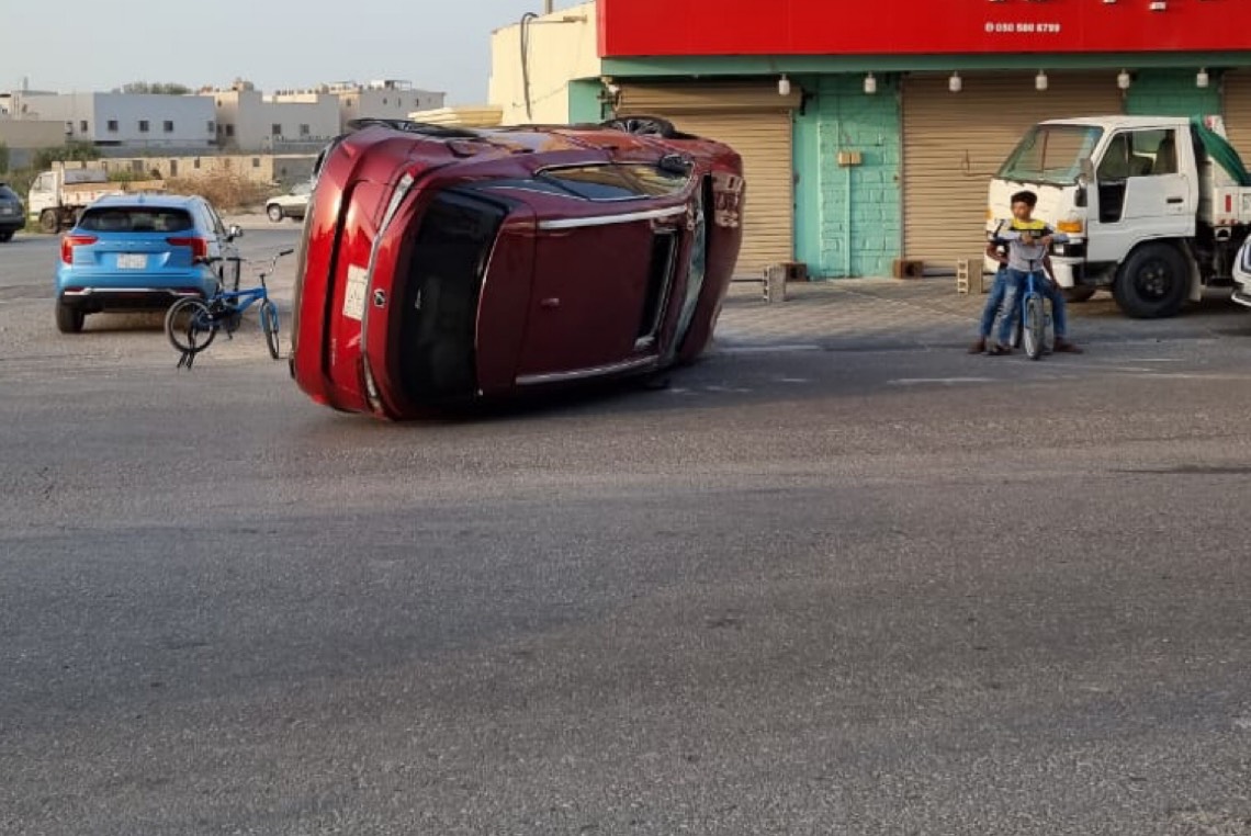 تعرض سائق سيارة لإصابات متوسطة اثناء تعرضه لحادث مروري على امتداد شارع احد بجزيرة تاروت مما ادى لانقلاب مركبته.
