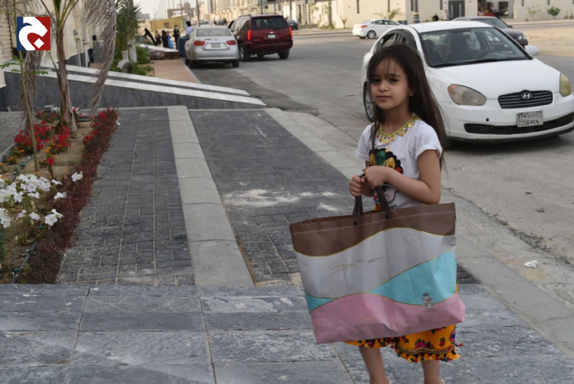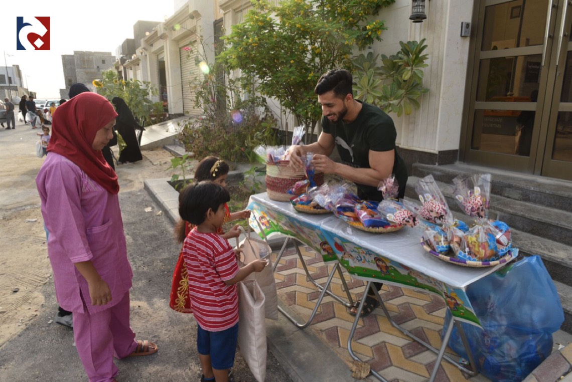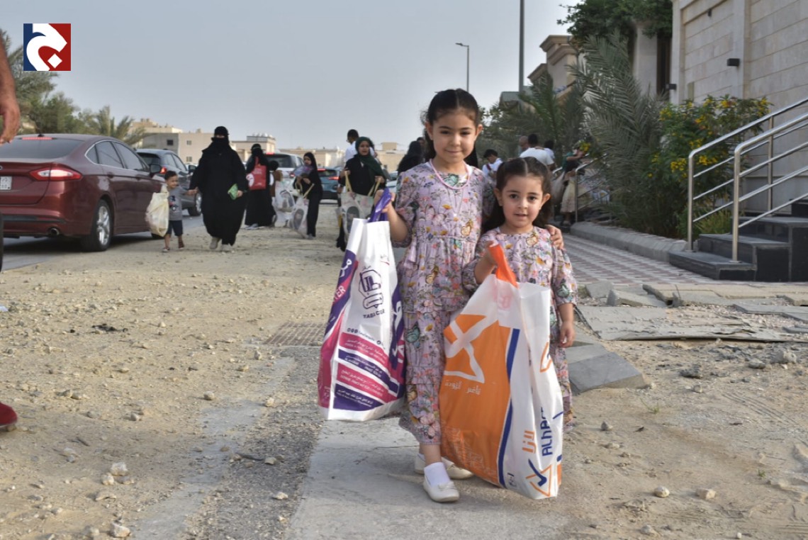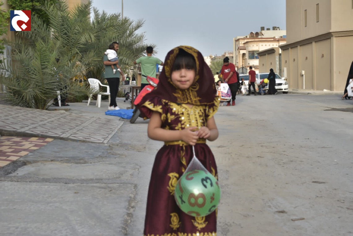 وانتشر الأطفال المتزينين بالثياب الخاصة بالقرقيعان وهم يحملون الأكياس مارين بمنازل الأقارب والجيران لجمع الهدايا والحلويات وهم يرددون بصوت مسموع ”ناصفة حلاوة أعطونا الله يعطيكم“.