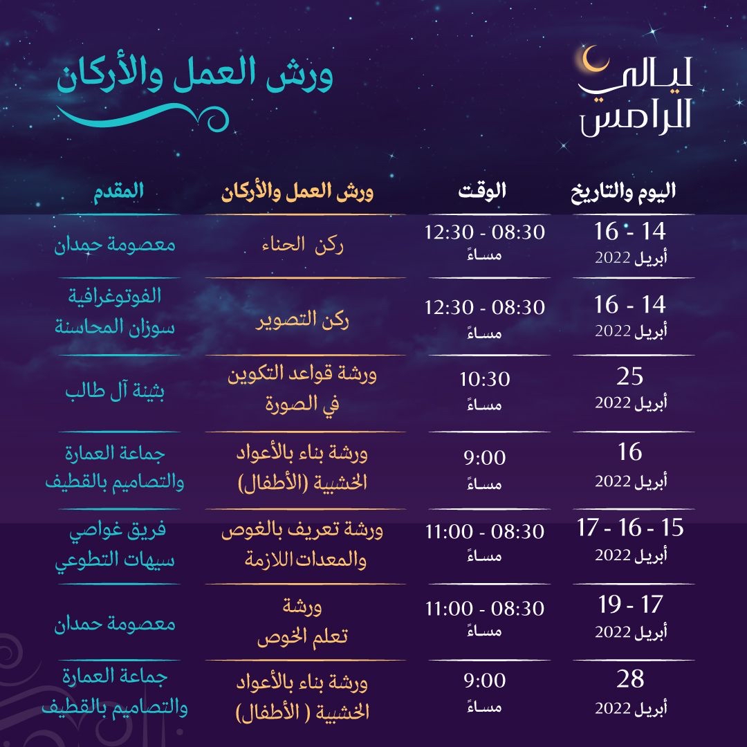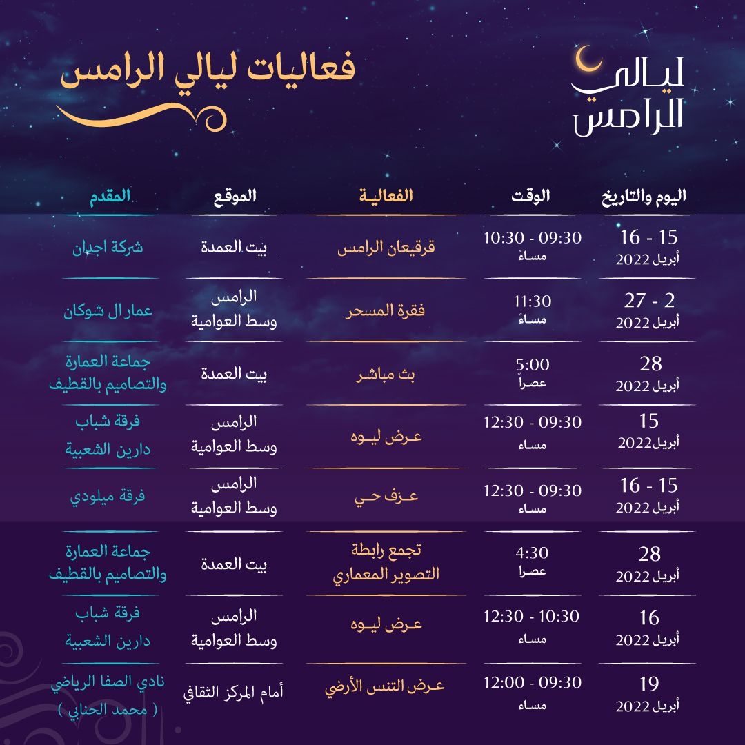 يذكر أن مركز الرامس بوسط العوامية يحيي ليالي رمضان الكريم بفعاليات متنوعة ما بين الثقافي والترفيهي ويحتضن العديد من الأركان التجارية والتوعوية والفنية.