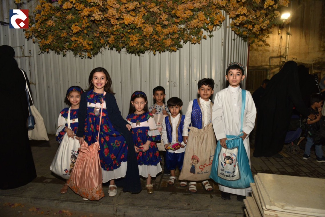 وانتشر الأطفال المتزينين بالثياب الخاصة بالقرقيعان وهم يحملون الأكياس مارين بمنازل الأقارب والجيران لجمع الهدايا والحلويات وهم يرددون بصوت مسموع ”ناصفة حلاوة أعطونا الله يعطيكم“.