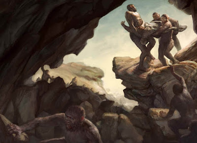 الصورة: غفي تصوير هذا الفنان، يتخلص انسان الناليدي Homo naledi من موتاه في كهف النجم الصاعد Rising Star بجنوب إفريقيا. على الرغم من أن مثل هذا السلوك المتقدم غير معروف في غيره من أشباه البشر الأوائل، فإن الذين اكتشفوا الأحفوريات يقولون إنه لا يوجد تفسير منطقي آخر له.