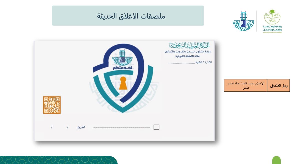 وتأتي الخطوة لتغيير مفهوم إجراءات الإغلاقات التقليدية، كما تم تخصيص 5 ألوان لكل نوع مخالفة سجلت على المنشأة المغلقة، ويرمز كل لون ما بين إغلاق بسبب تسمم غذائي، أو الاشتباه بحالات تسمم، أو إغلاق لإعادة تأهيل المنشأة، أو مخالفة بسبب فتح المنشأة دون الحصول على التراخيص، أو تم إغلاقها لمخالفتها للإجراءات الاحترازية.
