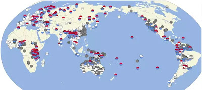 الشكل: تستخدم العديد من اللغات في العالم كلمات مثل ”ماما“ أو ”بابا“ للإشارة إلى ”أمي“ و”أبي“. اللغات التي فيها كلمة ”ماما“ ملونة باللون الأحمر، واللغات التي فيها كلمة ”بابا“ ملونة بالأزرق.
