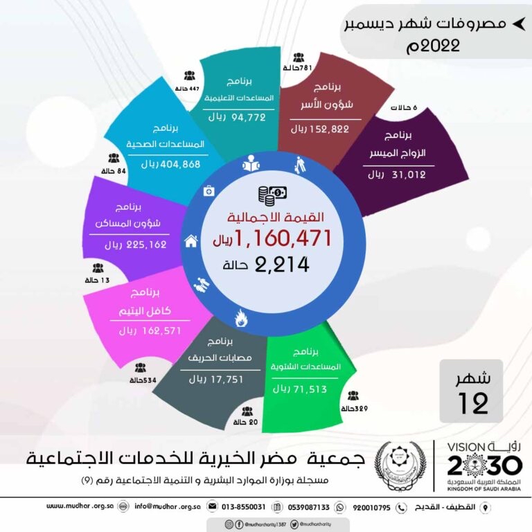 وأوضحت جمعية مضر الخيرية أن مصروفات برنامج المساعدات الصحية تصدرت جميع المصروفات بمبلغ 404,868 ريالا من إجمالي مصروفات ديسمبر وبنسبة 35%، ولذلك لتغطية التكاليف العلاجية لـ 84 حالة، وتقديم الرعاية الصحية لـ 20 مصاباً من مصابات الحريق والتي بلغت 17,751 ريالا