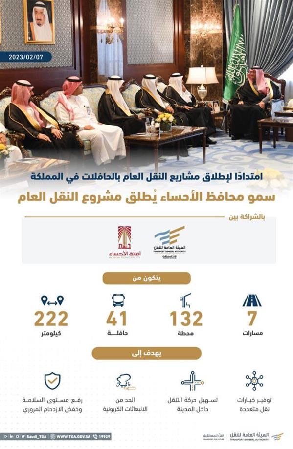 أطلق محافظ الأحساء الأمير سعود بن طلال بن بدر، مشروع النقل العام بالحافلات في المحافظة، بحضور رئيس الهيئة العامة للنقل المكلف الدكتور رميح بن محمد الرميح، ووكيل أمين الأحساء للتعمير هشام المرجان.