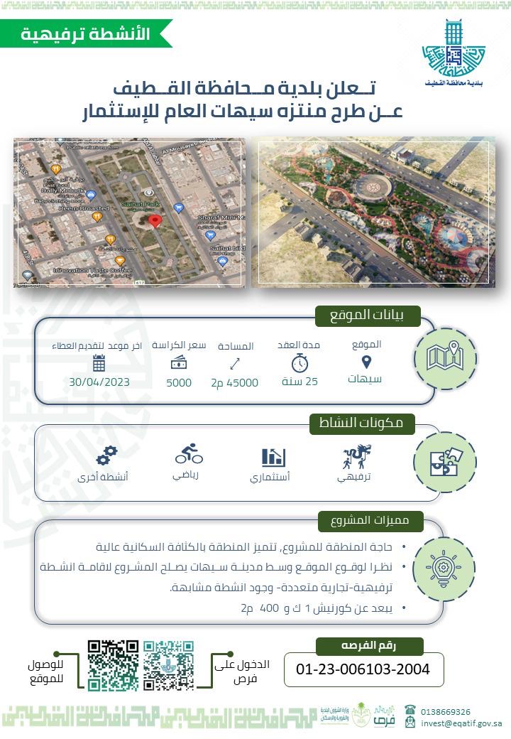طرحت بلدية محافظة القطيف، فرص استثمارية لـ «حديقة منتزه سيهات العام، بمساحة 45000 ألف متر، وحديقة الغدير بمساحة 3396 ألف متر» والتي تعتبر حدائق قائمة ومكتملة الخدمات، وبعقود تمتد لـ 25 سنة.