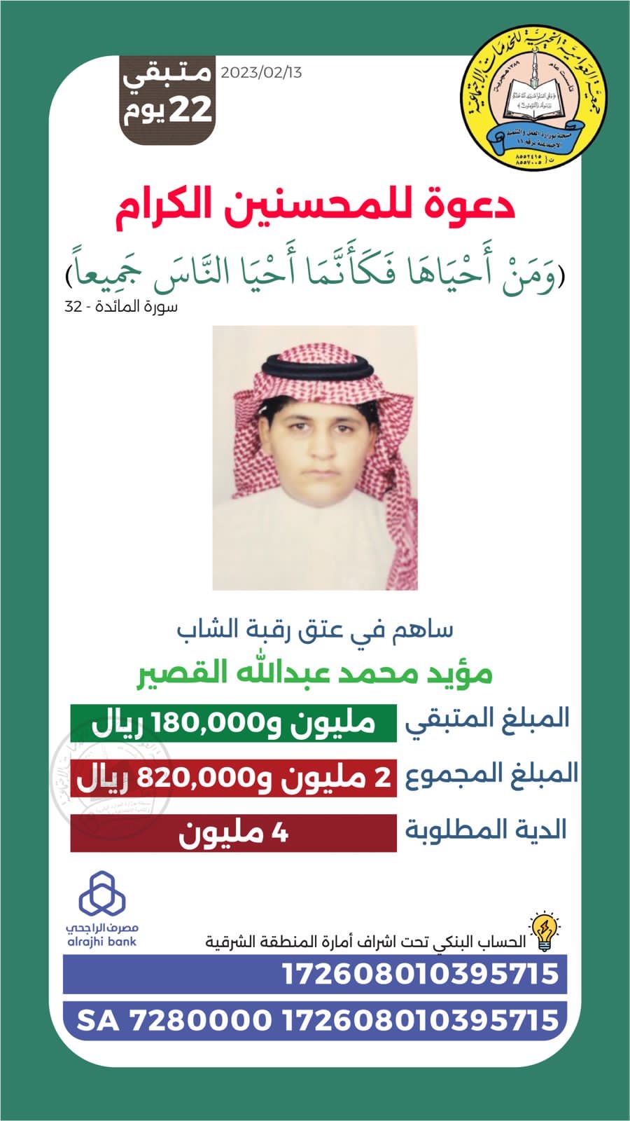 وأوضحت الجمعية أن رصيد الحساب الذي تشرف عليه إمارة المنطقة الشرقية وصل مليونين و820 ألف ريال، فيما يتبقى مليون و180 ألف ريال من أجل الوصول لمبلغ الدية التي يطالب بها أهل القتيل، والتي تبلغ 4 ملايين ريال.