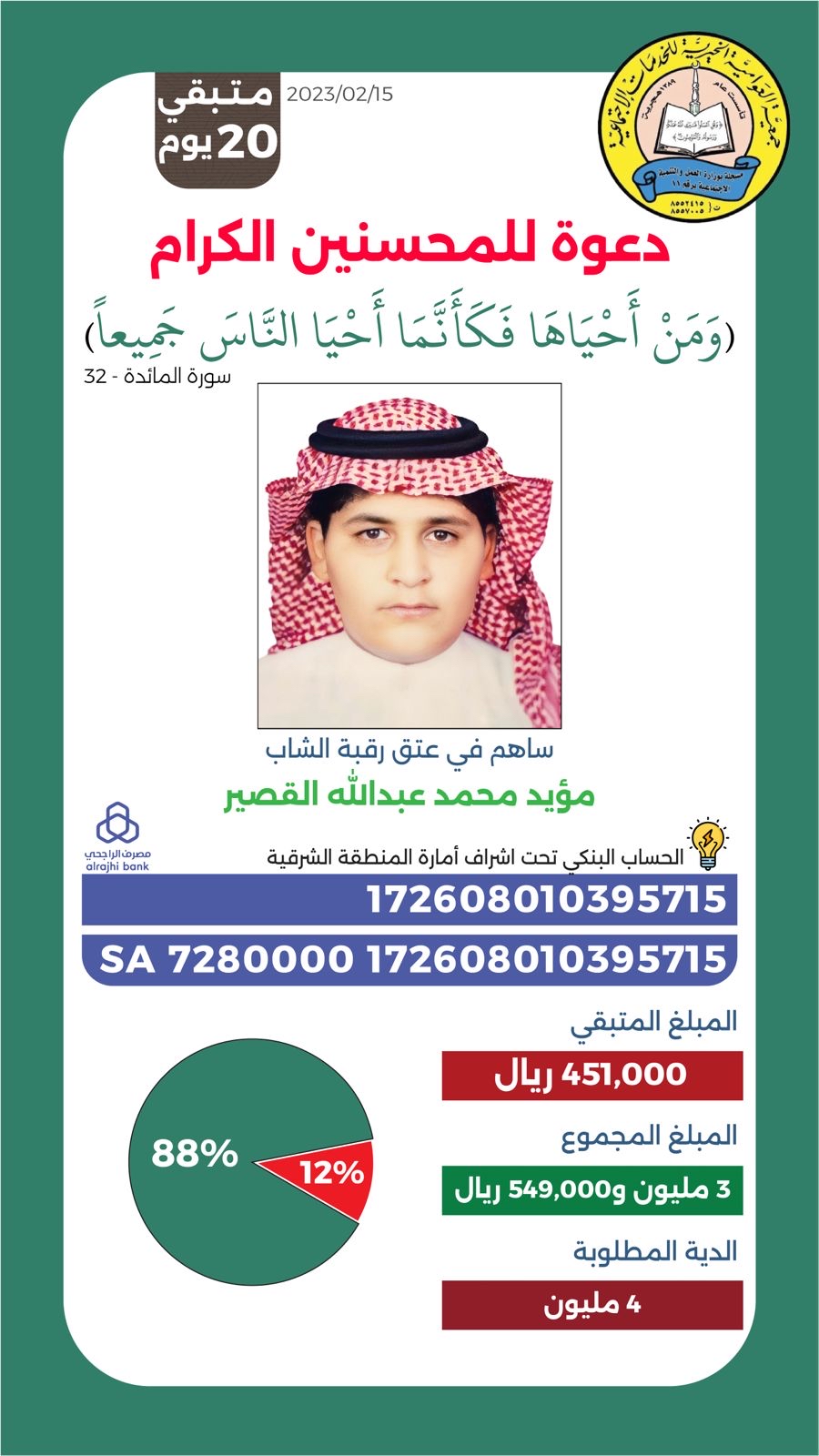 وأوضحت الجمعية أن رصيد الحساب الذي تشرف عليه إمارة المنطقة الشرقية وصل 3 مليون و549 ألف ريال، فيما تبقى 451 ألف ريال من أجل الوصول لمبلغ الدية التي يطالب بها أهل القتيل، والتي تبلغ 4 ملايين ريال.
