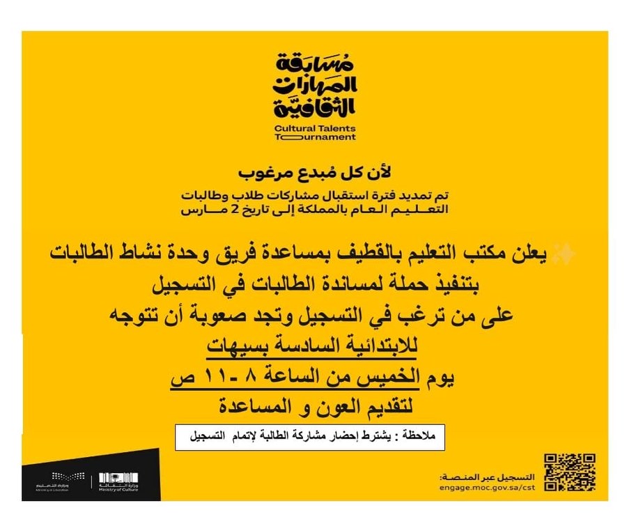 أعلن مكتب تعليم القطيف متمثلًا بوحدة نشاط الطالبات عن تنفيذ حملة لمساعدة الطالبات في التسجيل لمسابقة المهارات الثقافية.
