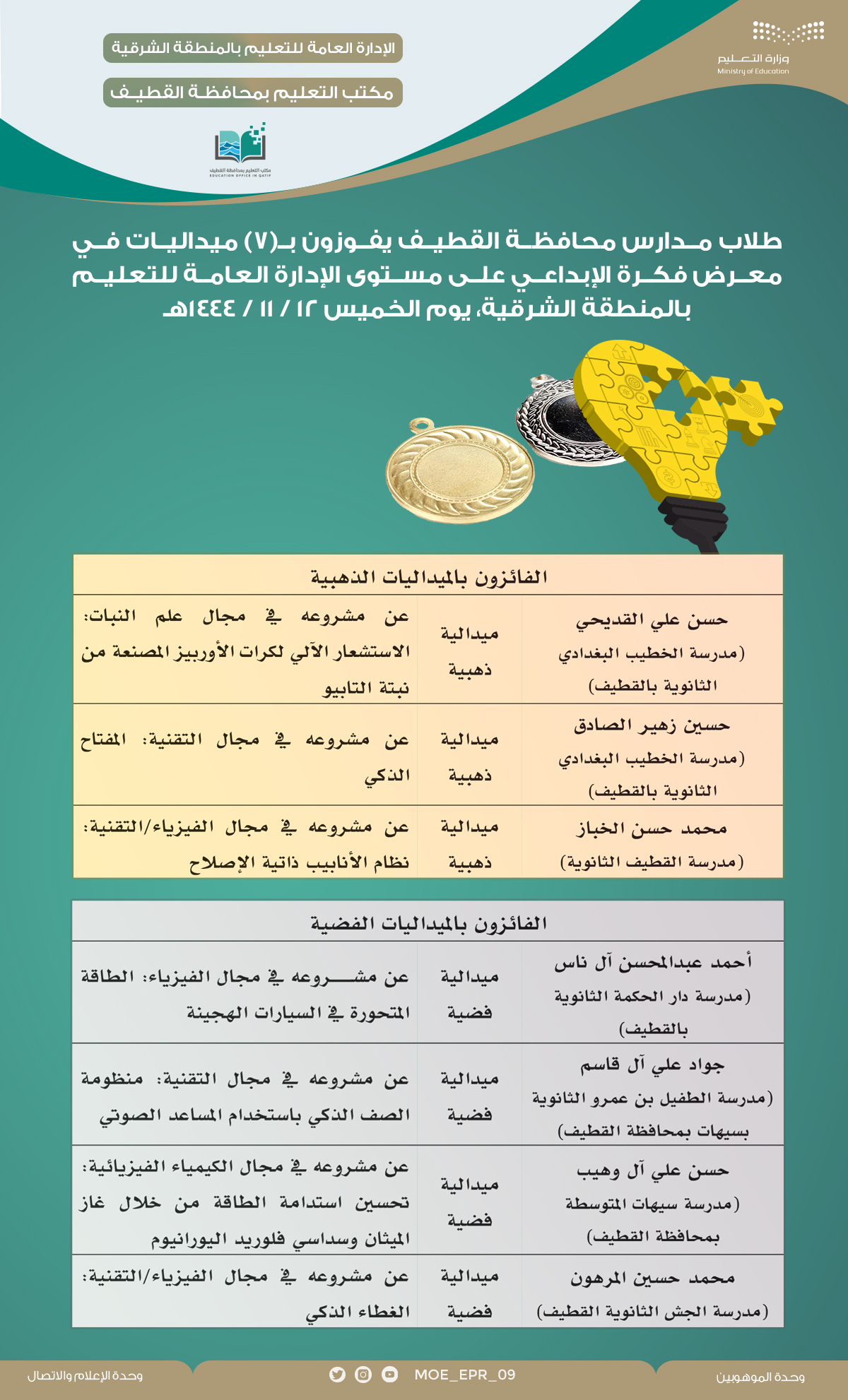 تمكن طلاب مدارس محافظة القطيف من حصد 7 ميداليات ذهبية وفضية، في معرض ”فكرة“ الإبداعي 2023 من بين 60 مشروعاً علميًا مشاركًا والذي نظمته إدارة الموهوبين «بنين» على مستوى الإدارة العامة للتعليم بالمنطقة الشرقية في نسخته الخامسة.