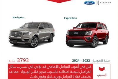 أعلنت وزارة التجارة عن استدعاء فوري لـ 3,793 مركبة، تشمل طرازي لينكون ”Navigator“ وفورد ”Expedition“ من موديلات 2022 إلى 2024، وذلك لوجود خلل مصنعي قد يهدد سلامة الركاب. وأوضحت الوزارة أن سبب الاستدعاء يعود إلى احتمالية وجود خلل في أنبوب الفرامل الأمامي. وذكرت أن هذا الخلل قد يؤدي إلى تسرب سائل الفرامل، نتيجة احتكاكه المستمر بأنبوب مخرج فلتر الهواء، وهو ما يُضعف كفاءة نظام الفرامل بشكل كبير ويزيد من خطر وقوع الحوادث. ودعت... |