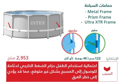 استدعت وزارة التجارة 2,953 من حمامات السباحة المنزلية التي تحمل العلامة التجارية ”انتكس“ ”INTEX“، وذلك لوجود خلل في التصميم قد يشكل خطراً جسيماً على سلامة الأطفال. وأوضحت الوزارة أن الاستدعاء يشمل أنواع ”Metal Frame - Prism Frame - Ultra XTR Frame“ التي يبلغ ارتفاعها 122 سم ”48 بوصة“ أو أكثر. ويكمن الخطر في احتمالية استخدام الطفل لحزام الضغط الخارجي كدعامة للوصول إلى المسبح بشكل غير متوقع، مما قد يؤدي إلى سقوطه وتعرضه... |