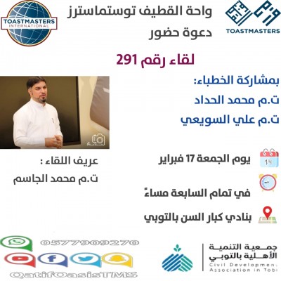 ينظم نادي واحة القطيف ”توستماسترز“ لقائه رقم 291، في تمام السابعة من مساء غدٍ الجمعة، في نادي كبار السن في التوبي. ويشهد اللقاء مشاركة خطيبين، هما التوستماستر الجديد محمد الحداد، والتوستماستر الخبير علي السويعي، بخطبتين معدتين، وذلك بقيادة رئيس النادي التوستماستر محمد آل جاسم. ودعا النادي جميع المهتمين من الرجال للحضور والمشاركة في فقرات الاجتماع، وأهمها فقرة الخطب الارتجالية، والاستفادة من الخبرات لدى أعضاء النادي في مهارات التواصل والمهارات القيادية. يُذكر أن نادي ... |