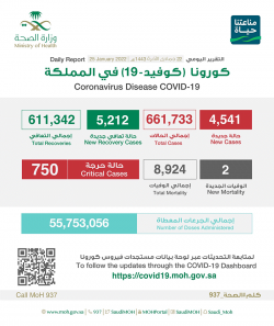 أعلنت وزارة الصحة إحصائية جديدة لمستجدات كورونا في المملكة خلال ال 24 ساعة الماضية تضمنت تسجيل ”4541“ حالة مؤكدة. ”46“ في القطيف و”13“ بصفوى و”1“ بسيهات. وبينت الإحصائية أن إجمالي عدد الإصابات في المملكة بلغ ”661733“ حالة. كما أعلنت الصحة عن تسجيل ”5212“ حالة تماثلت للشفاء، ليصل مجموع المتعافين إلى ”611342“ حالة تعافي، فيما ارتفع إجمالي الوفيات في المملكة إلى ”8924“ حالة بعد تسجيل ”2“ حالة وفاة جديدة. وبلغ إجمالي الحالات النشطة ”42,140“ حالة،... |