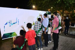 شارك عدد من مرتادي مسجد المسألة بمحافظة القطيف، في رسم لوحة فنية نصرة للنبي محمد (ص). وشارك رجال القطيف وأبناؤها في رسم وتلوين اللوحة تحت مسمى ”رسول المحبة محمد رسول السلام“. وقال أحد المشاركين في التلوين ”محمد جمال“، إن ألوان اللوحة لها ترجمة، وهي أن إشراقة الرسالة واخضرار صحراء الدنيا بمولده، لذا امتزجت ألوانها صفراء وخضراء. وتابع: ”عن كلمة المحبة، حيث الحب، فامتزجت ألوانها بدرجات الأحمر تعبيرا عن معانيها“. وأكمل: ”كلمة السلام امتزجت بالألوان ... |