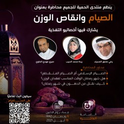 ينظم منتدى الحمية للجميع محاضرة بعنوان ”الصيام وانقاص الوزن“ تفاعلية على الانستغرام وتتناول المحاضرة التي يشارك فيها أخصائيو التغذية ريدة الحبيب ورضي العسيف وصبري الغاوي، عددا من المحاور منها الصيام الإسلامي أم الصيام المتقطع؟ وهل شهر رمضان الوقت المناسب لفقدان الوزن؟ وكيف نقلل من الدهون في شهر رمضان؟ الزمان: يوم الاثنين 6 رمضان _ 19 أبريل الوقت :العاشرة مساءً.... |