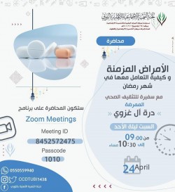 تنظم لجنة التنمية الاجتماعية الأهلية بالتوبي مساء اليوم السبت عبر برنامج زووم محاضرة بعنوان ”الأمراض المزمنة وكيفية التعامل معها في شهر رمضان“، تقدمه الممرضة درة آل غزوي. رقم الاجتماع 8452572475 رمز الدخول 1010 الزمان: السبت 24 أبريل 2021 الوقت: 9 - 10:30 مساء... |