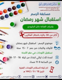 تنظم لجنة التنمية الاجتماعية الأهلية بالتوبي مسابقة في الرسم للجنسين بموضوع ”استقبال شهر رمضان“ تحت اشراف التشكيلية دلال الجارودي، وتقدم الأعمال في الفترة ما بين 16 و17 و18 من الشهر الجاري. وتستهدف المسابقة الجنسين من عمر 7 -15 سنة وتستقبل اللوحات في مقر اللجنة بالتوبي من الساعة 9 - 11 مساء. ملاحظة: آخرموعد لاستلام اللوحات بتاريخ 18 / 9 / 1442 الموافق 30 أبريل... |