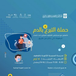 ينظم مستشفى القطيف المركزي بالتعاون مع نادي الخويلدية الرياضي حملة للتبرع بالدم. وتستمر الحملة على مدى يومين متتاليين تحت شعار «دمك دمهم» في نسختها العاشرة. يستلزم إحضار الهوية الوطنية للتبرع، ووجود تطبيق «توكلنا». الزمان: يومي الثلاثاء والأربعاء 6-7 أبريل. الوقت: الساعة 4 عصرا - الساعة 9 مساء. المكان: نادي الخويلدية الرياضي.... |