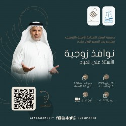 تنظم جمعية العطاء النسائية الأهلية بالقطيف اللقاء الافتراضي الخاص بمشروع ”يسر لتيسير الزواج“ بعنوان: ”نوافذ زوجية“ والذي يقدمه المدرب علي العباد . الزمان: الثلاثاء15 يونيو الوقت: من الثامنة وحتى العاشرة مساءً رابط اللقاء على منصة زوم: |