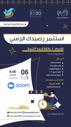 تنظم جائزة التفوق الدراسي بأم الحمام ورشة «استثمر رصيدك الزمني» مع المدربة التربوية المعتمدة عاتقة احمد الشيخ يوم الثلاثاء عبر برنامج زووم. الزمان: يوم الثلاثاء 6 يوليو الوقت: الثامنة مساءً الفئة المستهدفة: طالبات المرحلة المتوسطة والثانوية للاطلاع على محاور الدورة وسيرة المدربة: https://instagram.com/antumfakhruna?igshid=vl9ketn6y4h1 سيتم إرسال الرابط قبل الدخول للورشة ... |