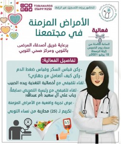 ينظم فريق أصدقاء المرضى بالتوبي ومركز صحي التوبي فعالية «الأمراض المزمنة في مجتمعنا» يوم الخميس وذلك بحضور جزء من الكادر الصحي التابع لمركز صحي التوبي وتهدف الفعالية إلى توعية المجتمع بمخاطر الأمراض المزمنة وتوضيح أهمية معرفة التاريخ العالي الطبية في تفادي الأصابة المبكرة. وتتضمن الأمسية عدة فعاليات من ضمنها: ركن قياس السكر وقياس الضغط ركن كيف اتعامل مع جهازي؟ «يستلزم احضار جهازك ليتم تعليمك ع استخدامه» 3. محاضرة مع أخصائية التغذية ريده الحبيب ... |