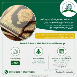 دار المرتضى لعلوم القرآن الكريم تعلن عن بدء التسجيل للفصل الدراسي الأول للعام الجديد 1442 عن بعد «اون لاين» عبر برنامج Google meet تعلم معنا أحكام التجويد والقراءة الصحيحة للقرآن الكريم تجويد - حفظ - عقائد .. على يد معلمين مختصين. مع مسابقات وجوائز قيمة للطلاب ورحلات ترفيهية. - يبدأ البرنامج من 19 محرم حتى 24 ربيع الآخر. - 3 أيام في الأسبوع: الاثنين - الثلاثاء - الاربعاء. ... |