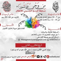 أطلقت مؤسسة سيهات كياني مسابقة الرسم الحسيني للأطفال بعنوان «من وحي عاشوراء» حيث تستقبل المشاركات حتى الخامس عشر من محرم. الفئات المستهدفة من 7 - 10 سنوات / ثلاث فائزين من 10 - 12 سنة / ثلاث فائزين مقاس الرسومات: لاتزيد عن 60 * 80 سم الألوان: ... |