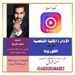 يتحدث خليل الفريح والذي يعد مؤسسا لعدة شركات وخبير في مجال التقنية المالية حول «الإدارة المالية الشخصية في زمن الكورونا» يوم الأربعاء على حساب المعلق الصوتي أحمد قريش. الزمان: يوم الأربعاء 13 مايو الوقت: 9:30 مساء للانضمام للأمسية عبر انستقرام المعلق الصوتي أحمد قريش من هنــا... |
