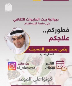 تنظم ديوانية بيت العليوات الثقافي على منصة الانستقرام محاضرة «فطوركم.. علاجكم» مع أخصائي التغذية رضي العسيف. الزمان: يوم الأثنين 11 مايو الوقت: 5:30 عصرًا لمتابعة البث على الانستقرام هنـا... |