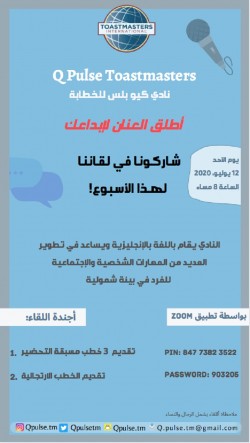 ينظم نادي كيو بلس للخطابة لقائه الأسبوعي تحت عنوان «إطلاق العنان لإبداعك» وذلك يوم غدا الأحد عبر تطبيق زووم. ويقام النادي الذي يعد أحد نوادي التوستماسترز في منطقة القطيف باللغة الإنجليزية حيث يساعد في تطوير العديد من المهارات الشخصية والاجتماعية للفرد في بيئة شمولية. وتشتمل أجندة اللقاء على: تقديم 3 خطب مسبقة التحضير تقديم الخطب الارتجالية للانضمام عبر تطبيق زووم: PIN: 847 7382 3522 ... |