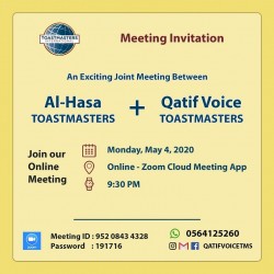 يقيم ناديا الأحساء وصوت القطيف لقاء توستماسترز مشترك مساء الاثنين حيث يشارك أعضاء الناديين في هذا اللقاء بخطب معدة وخطب إرتجالية باللغة الإنجليزية. ويبدأ اللقاء في التاسعة والنصف مساء حيث سيكون اللقاء على منصة زوم للاجتماعات الافتراضية. يذكر بأن نادي الأحساء أحد أعرق الأندية في المنطقة وتأسس عام 2005، ويقيم الناديان لقاءاتهما كل أسبوعين باللغة الإنجليزية. ويعد نادي صوت القطيف أحد أندية التوستماسترز الجديدة ولا يزال تحت التأسيس. الجدير بالذكر بأن اجتماعات أندية التوستماسترز... |
