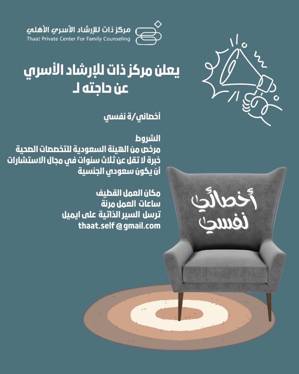 يعلن مركز ذات للإرشاد الأسري عن حاجته إلى