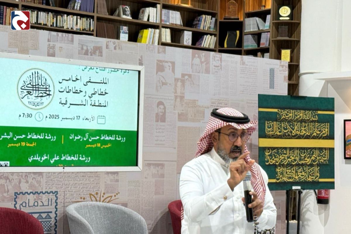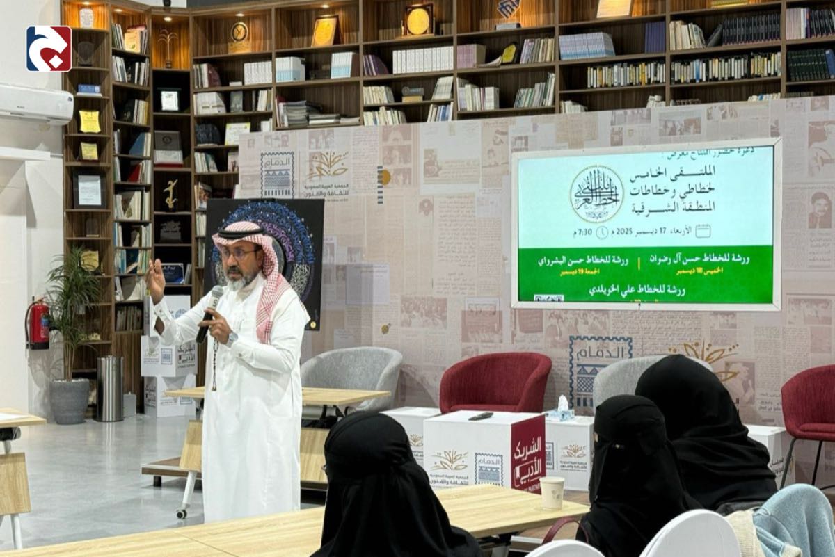 دشنت الجمعية العربية السعودية للثقافة والفنون بالدمام فعاليات ”الملتقى الخامس لخطاطي وخطاطات المنطقة الشرقية“، مساء الأربعاء الماضي، بورشة عمل نوعية للخطاط حسن آل رضوان.