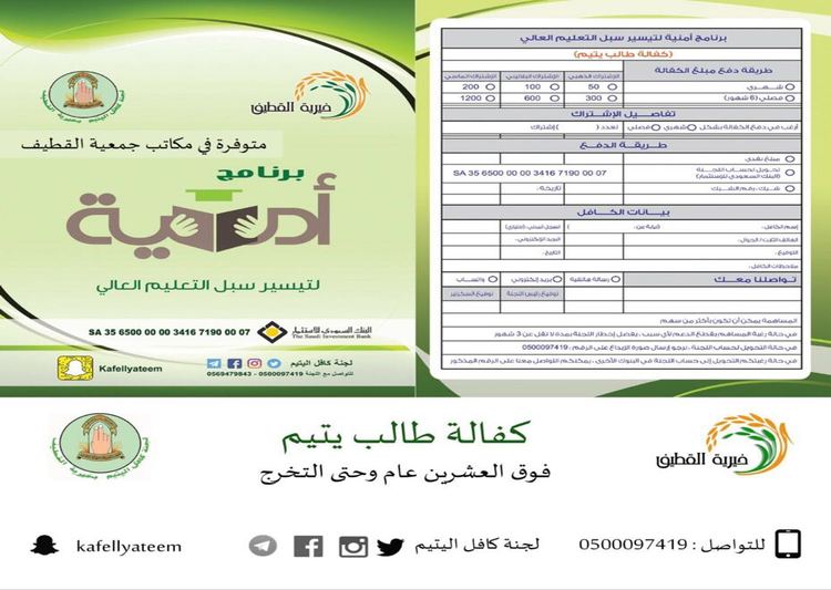 يمكن للراغبين بالمشاركة، الحصول على استمارة ”كفالة طالب يتيم“ من خلال مكاتب جمعية القطيف الخيرية، كما يمكن المساهمة في ”برنامج أمنية“ عبر حساب اللجنة على البنك السعودي للاستثمار.