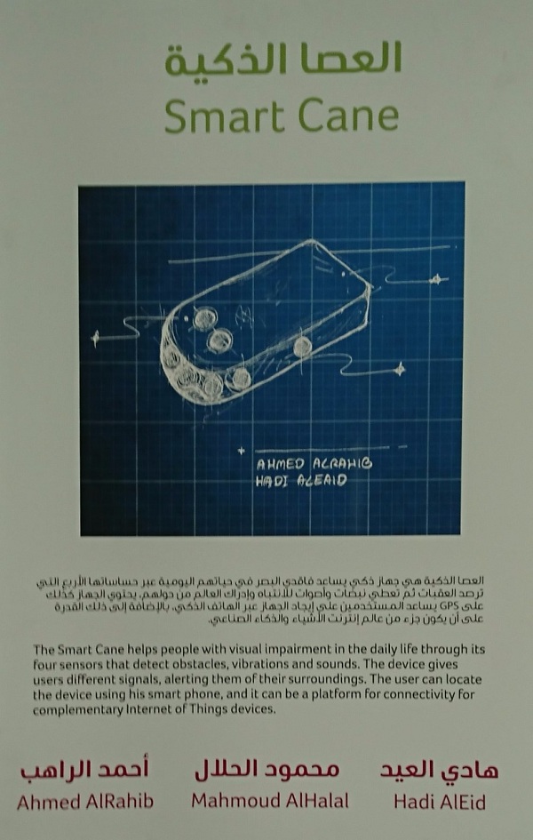 تعاون 4 طلبة من طلاب جامعة الملك فهد للبترول والمعادن لتطوير عصا المكفوفين التقليدية؛ واستبدالها بجهاز «ايكوسينس».