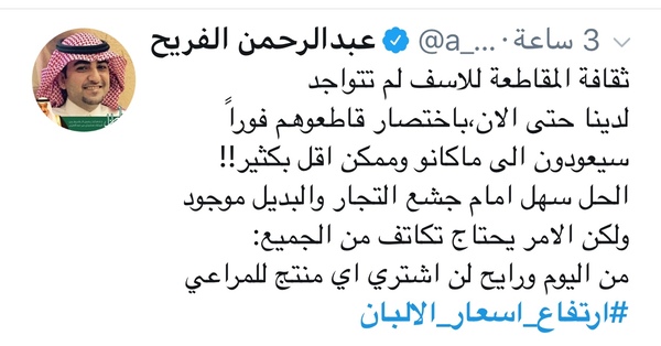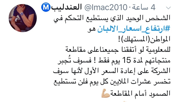 وقال مواطن عبر حساب العندليب مغردًا أن الشخص الوحيد الذي يستطيع التحكم في # اسعار_ ارتفاع _ الألبان هو المواطن ”المستهلك“.