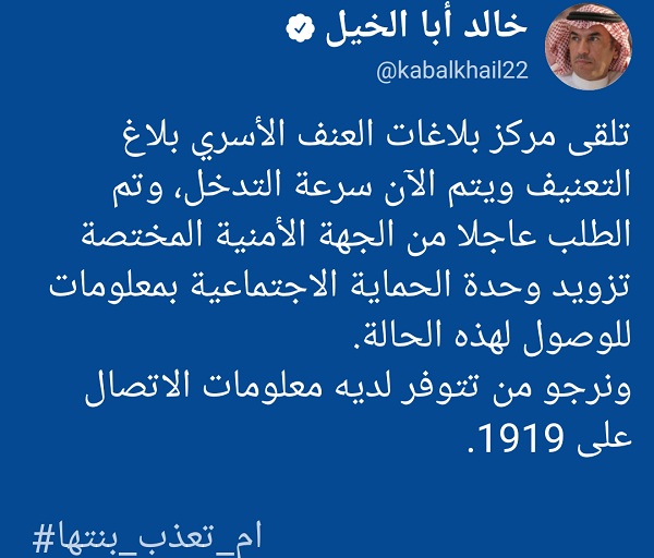 وقال المتحدث الرسمي لوزارة العمل والتنمية الاجتماعية خالد أبا الخيل في تغريدة عبر حسابه الرسمي بتويتر «تلقى مركز بلاغات العنف الأسري بلاغ التعنيف ويتم الآن سرعة التدخل وتم الطلب عاجلا من الجهة الأمنية المختصة تزويد وحدة الحماية الاجتماعية بمعلومات للوصول لهذه الحالة».