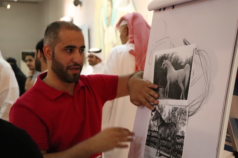 قدّم الفنان محمد المؤمن ورشة لرسم الخيل ضمن أنشطة المعرض والمفتتح الخميس الماضي ويستمر حتى الأثنين لمجموعة «فن يحكى»، في قاعة عبدالله الشيخ بجمعية الثقافة والفنون، يوم أمس.
