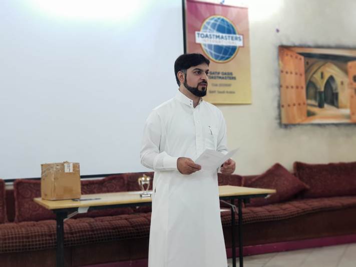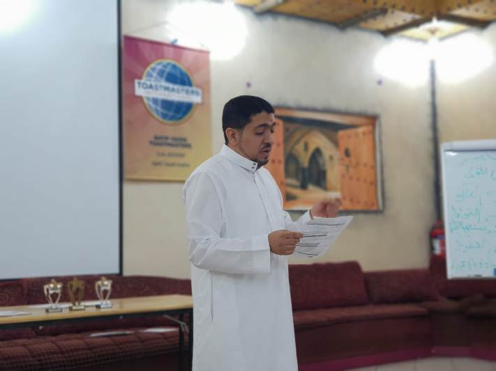 واستعرض التوستماستر علي السويعي بعض قصصه من الأساليب القيادية المختلفة التي تؤثر سلباً وإيجابا في خطبة عنوانها ”عندما يكون الواقع أغرب من الخيال“.