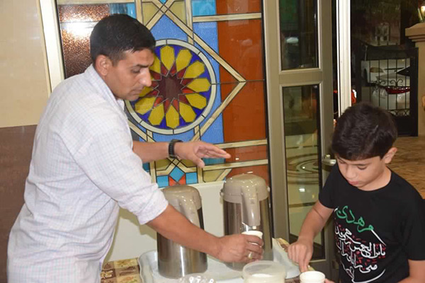 وتشترك مجاميع من الشباب في توزيع الطعام والشراب على المشاركين في المواكب، ويحرص الجميع على تناول شيء من هذا الطعام والشراب تبركا بالمناسبة.