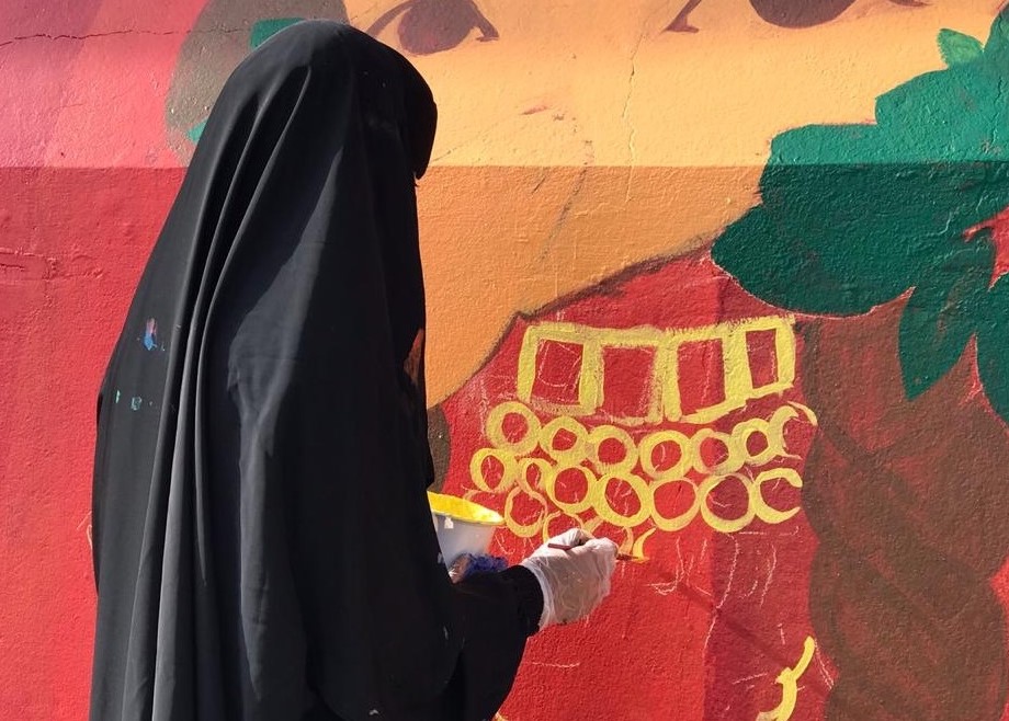 تشكيلية بـ ”عباءة الرأس“ تبهر زوار ”جدارية الوطن“ برسوماتها