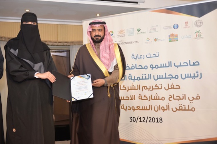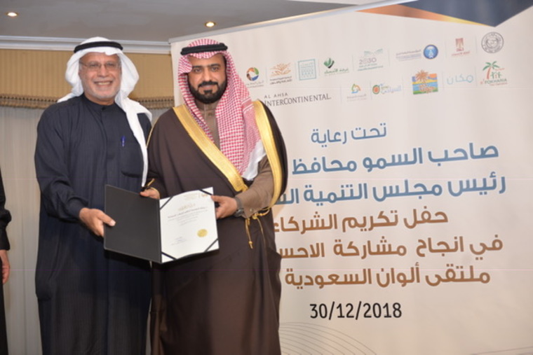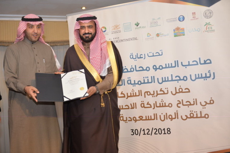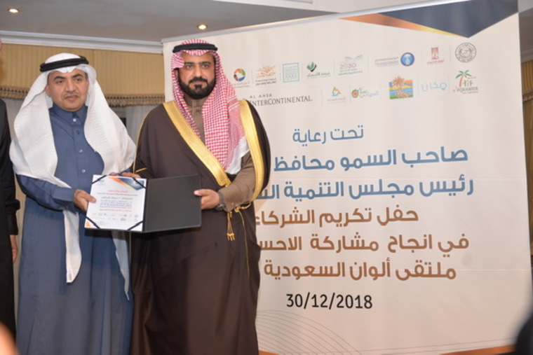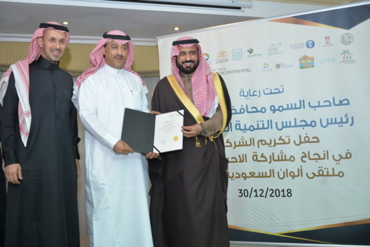 كُرِم شركاء النجاح في ملتقى ألوان السعودية 2018 تحت مظلة مجلس التنمية السياحة بالأحساء ، وذلك بقاعة الاندلس بأحد الفنادق وذلك برعاية محافظ الأحساء الأمير بدر بن جلوي ، وبحضور وكيل المحافظة معاذ الجعفري يوم الأربعاء.