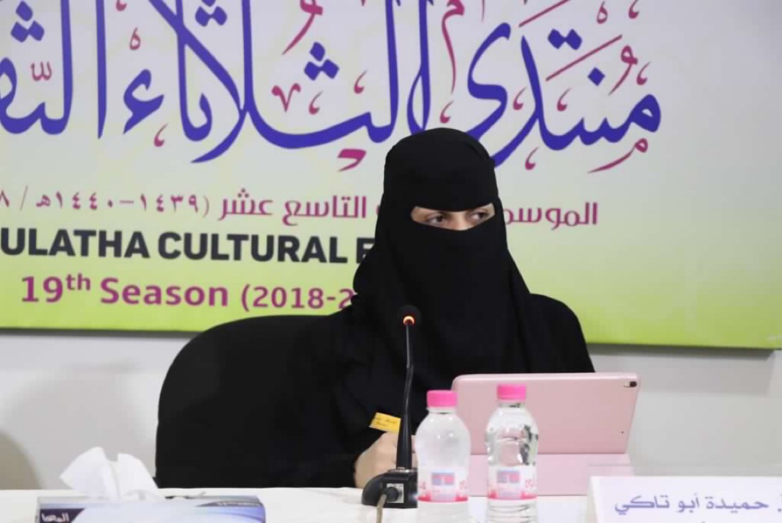 وقالت أبو تاكي والتي حضر معها أولادها الثلاثة: ”نشأتُ في كنف والدي الذي ولع بالفن والتراث الأصيل وحرص دائمًا على إقتناء كل ما له صلة بالتراث وهذا ما سحر لُبِّي وعكس ذلك على الكثير من لوحاتي التي تعتبر وقفات على مشاهد من التراث“.