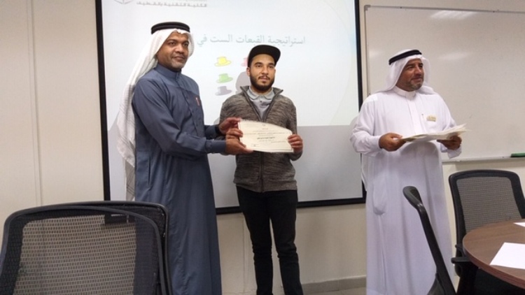 تعرف 26 متدربًا على استراتيجية القبعات الست في التفكير وذلك ضمن ورشة عمل للمتدربين نظمها قسم التقنية الادارية بالتعاون مع قسم التطوير والتدريب في كلية التقنية بالقطيف يوم الثلاثاء.