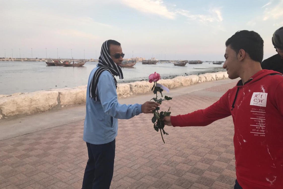 متطوعون يوزعون الورد في القطيف بمناسبة «يوم المحبة»